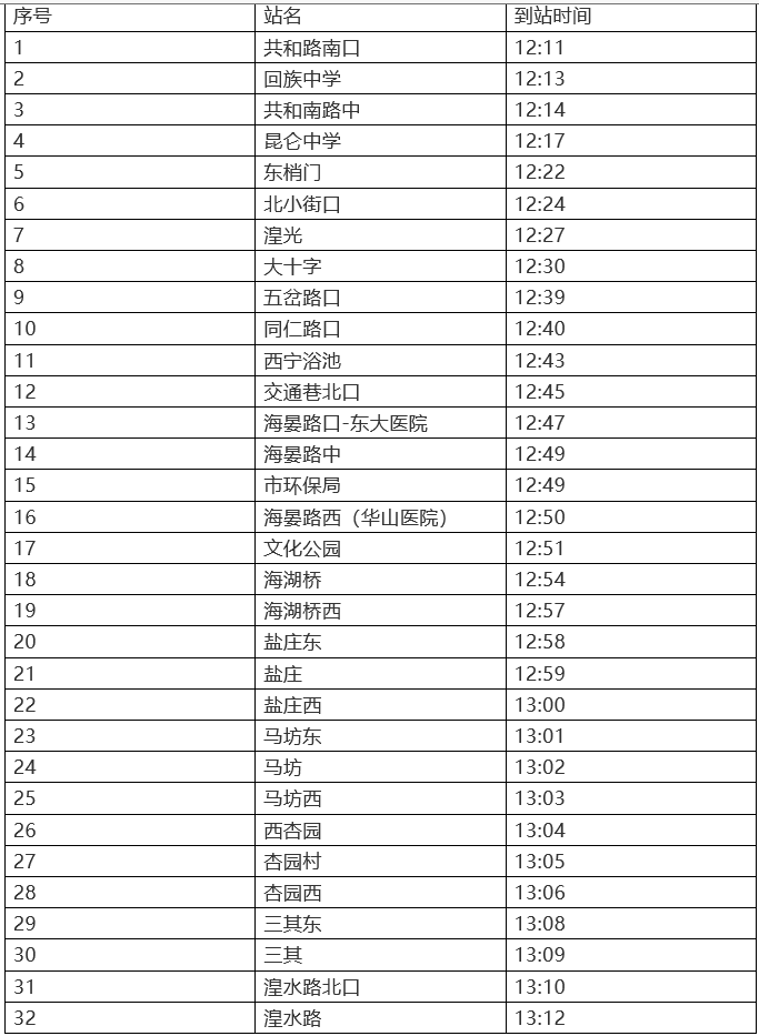 (三)1月23日乘坐26路公交車12時(shí)11分在共和路南口站(第一站)上車,車內(nèi)監(jiān)控顯示該乘客手提類似醫(yī)院檢查單據(jù),于12時(shí)58分在鹽莊東站下車,上車至下車共19站,26路(共和路南口至湟水路方向)當(dāng)日單程途徑站點(diǎn)及到站時(shí)間如下: