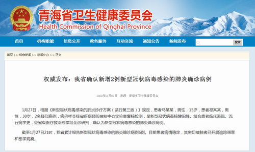 人民網(wǎng)西寧1月27日電(楊陽)本網(wǎng)從青海省衛(wèi)健委獲悉,1月27日,根據(jù)《新型冠狀病毒感染的肺炎診療方案(試行第三版)》規(guī)定,患者馬某某,男性,15歲,患者祁某某,男性,30歲,2名疑似病例,病例樣本經(jīng)省疾病預(yù)防控制中心實驗室復(fù)核檢測,呈新型冠狀病毒核酸陽性。結(jié)合患者臨床表現(xiàn)、流行病學史,經(jīng)青海省級醫(yī)療救治專家組會診研判,確認為新型冠狀病毒感染的肺炎確診病例。