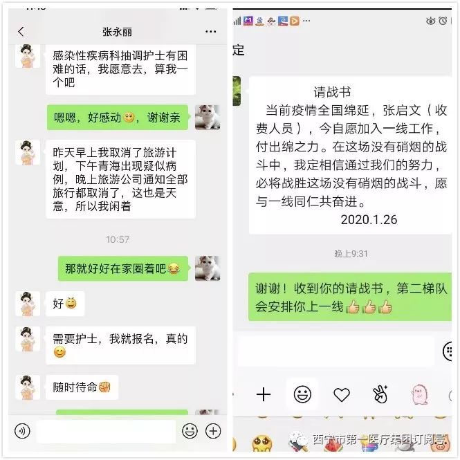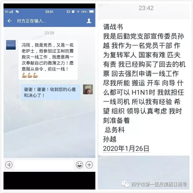 人民網(wǎng)西寧1月27日電(蔣瑩)“我是黨員,也是一名護士,參加過抗震救災一線工作,我愿意再次奉獻自己的微薄之力,服從命令,前往一線”。眼下,在青海人的微信朋友圈里,一條條醫(yī)務工作者主動請纓,支援武漢抗擊新型肺炎疫情的截圖溫暖著高原的冬日。