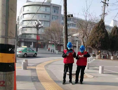 由于疫情防控,整潔的街道上少了昔日的車水馬龍,偶有幾個(gè)路人也是帶著口罩疾走,像服務(wù)隊(duì)員這般時(shí)而對(duì)著線路“指指點(diǎn)點(diǎn)”、時(shí)而拿著紅外線測(cè)溫儀測(cè)量并記錄的幾乎不多見,他們?cè)诩t馬甲的映襯下格外顯眼。