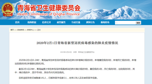 人民網(wǎng)西寧2月2日電(蔣瑩)2月2日,本網(wǎng)從青海省衛(wèi)生健康委獲悉,截至2月1日24時(shí),青海省報(bào)告新型冠狀病毒感染的肺炎新增確診病例0例,新增重癥病例0例,新增死亡病例0例,新增出院病例0例,新增疑似病例2例。