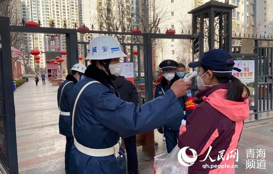 西寧社區(qū)執(zhí)勤人員為社區(qū)進(jìn)出居民監(jiān)測(cè)體溫。 圖片拍攝:蔣瑩