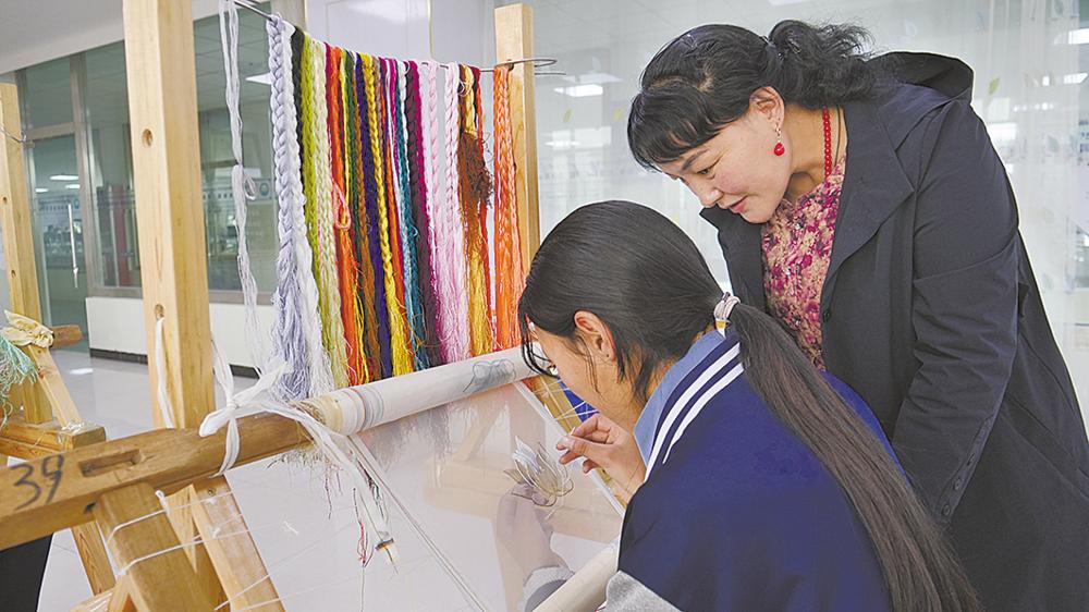 老師指導(dǎo)學(xué)生學(xué)習(xí)雙面繡。青海日?qǐng)?bào)記者 郭靚 攝