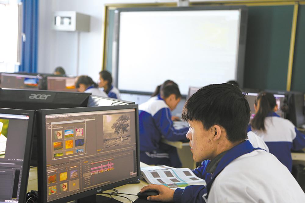 網(wǎng)絡(luò)新媒體專業(yè)部的學(xué)生在實(shí)訓(xùn)室里練習(xí)。 海南州職業(yè)技術(shù)學(xué)校供圖