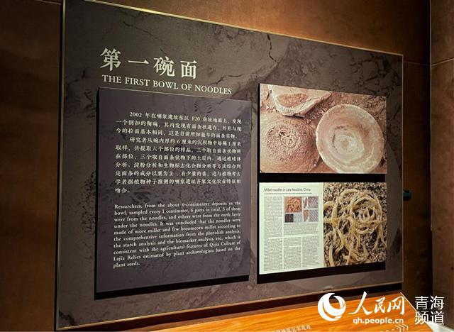 “這就是我們震驚世界的中華第一碗面!眻(chǎng)館工作人員介紹,2002年的冬天,青?脊抨(duì)在喇家遺址20號(hào)房址內(nèi)一個(gè)倒扣的陶碗內(nèi)發(fā)現(xiàn)的,經(jīng)過(guò)分析鑒定后發(fā)現(xiàn)面條的大量成分是粟,還有少量的黍,將這兩種糧食磨成粉,用水調(diào)和,擠壓的方式制作而成。并且在陶碗的泥土里發(fā)現(xiàn)了肉和調(diào)料的成分,說(shuō)明那時(shí)已經(jīng)有了對(duì)美味的追求。