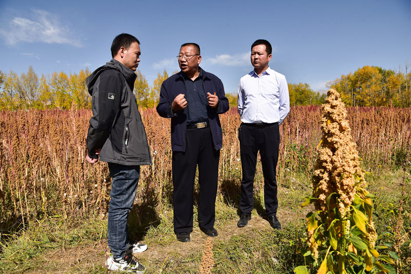 西莊村黨支部書記兼村委會主任馬曉平正在介紹今年藜麥的種植情況。金峰攝
