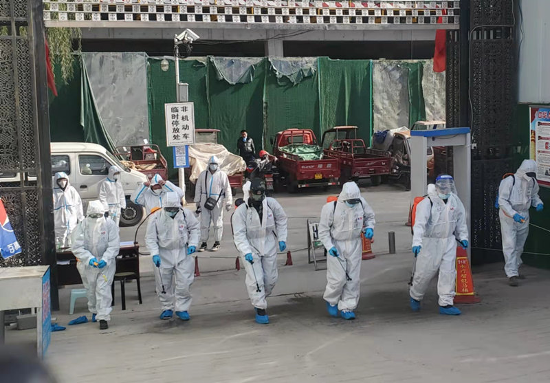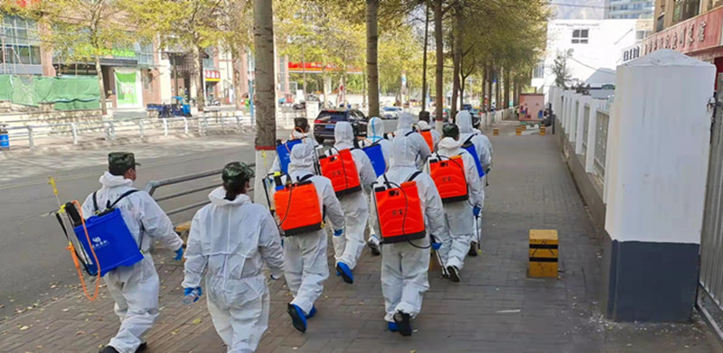 尚江民與退役軍人志愿者進(jìn)行消殺工作。西寧市退役軍人事務(wù)局供圖