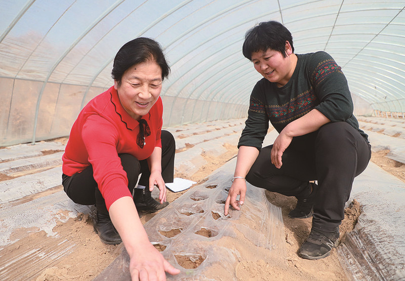 李玉蘭(左)退休不退崗,繼續(xù)致力于橋頭村的脫貧成果鞏固提升中。資料圖片