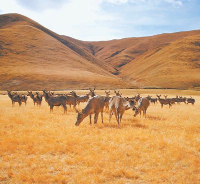 西藏自治區(qū)類烏齊縣長毛嶺國家級(jí)馬鹿自然保護(hù)區(qū),國家二級(jí)保護(hù)動(dòng)物馬鹿在悠閑覓食。
