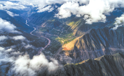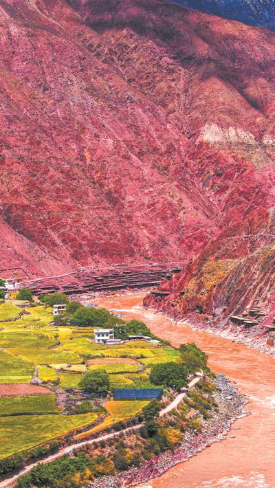 西藏自治區(qū)芒康縣曲孜卡鄉(xiāng)的瀾滄江大峽谷,江邊是村莊與鹽田。