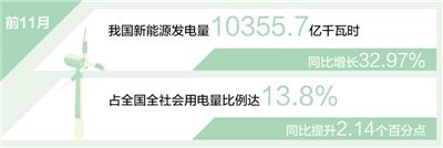 本報(bào)北京12月26日電 (記者丁怡婷)記者日前從國家能源局獲悉:今年前11月,我國新能源發(fā)電量達(dá)到10355.7億千瓦時(shí),年內(nèi)首次突破1萬億千瓦時(shí),同比增長32.97%,占全國全社會用電量的比例達(dá)到13.8%,同比提升2.14個(gè)百分點(diǎn)。10355.7億千瓦時(shí),基本相當(dāng)于今年同期的全國城鄉(xiāng)居民生活用電量數(shù)據(jù)。