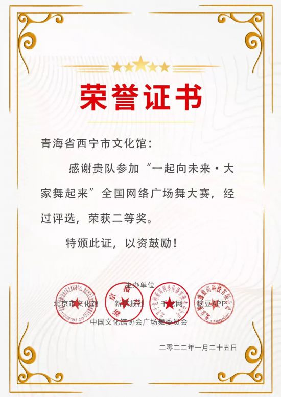 由文化和旅游部全國(guó)公共文化發(fā)展中心、中國(guó)文化館協(xié)會(huì)廣場(chǎng)舞委員會(huì)等多家單位聯(lián)合舉辦的“一起向未來·大家舞起來”全國(guó)網(wǎng)絡(luò)廣場(chǎng)舞大賽圓滿結(jié)束,全國(guó)共有500余支團(tuán)隊(duì)參加,西寧市文化館在此次評(píng)比中喜獲佳績(jī)。