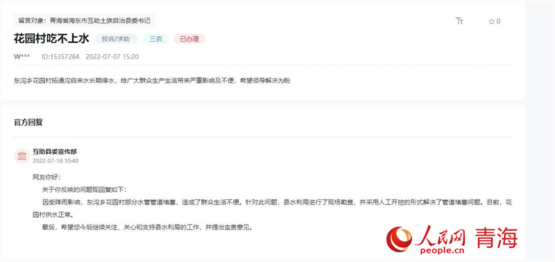 收到留言后,互助縣委宣傳部回復(fù),因受降雨影響,東溝鄉(xiāng)花園村部分水管管道堵塞,造成了群眾生活不便。針對此問題,互助縣水利局進(jìn)行了現(xiàn)場勘查,并采用人工開挖的形式解決了管道堵塞問題。目前,花園村供水正常。
