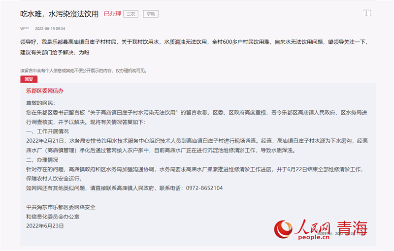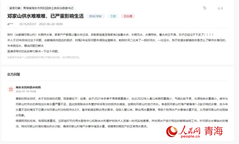 海東市民和縣水利局及時作出回復(fù):自入夏以來,群眾用水量驟增,導(dǎo)致個別用水戶水窖儲水量不足,針對部分水窖缺水的情況,特向鄧家山村調(diào)劑增加供水次數(shù),確保鄧家山村每戶水窖中儲足水量,保障農(nóng)戶的正常用水需求。