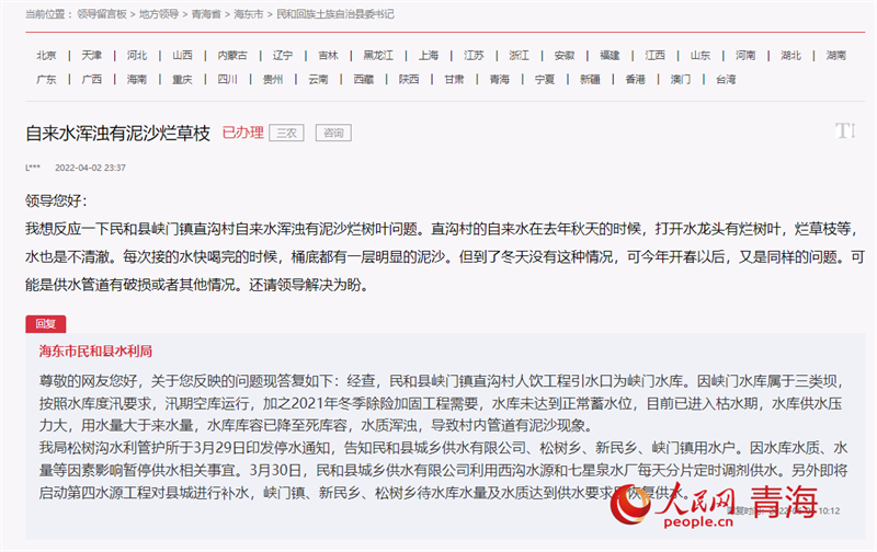 農(nóng)村飲水安全工程是一項(xiàng)惠及廣大群眾的民生工程。在人民網(wǎng)“領(lǐng)導(dǎo)留言板”上,飲水、供水問題是群眾最關(guān)注的話題之一。近日,來自青海省海東市互助縣花園村柘通溝的網(wǎng)友W*** 在人民網(wǎng)“領(lǐng)導(dǎo)留言板”留言,反映自己所住的村子長期停水,“給生產(chǎn)生活帶來嚴(yán)重影響,盼望解決。”該網(wǎng)友留言道。