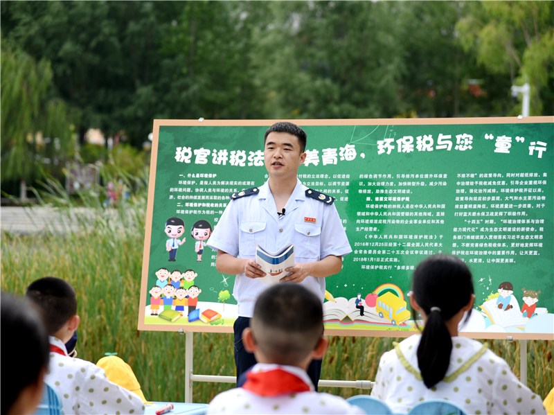 走出自然資源博物館,展廳內(nèi)的自然景觀在北川河濕地公園變成了現(xiàn)實。在波光粼粼的北川河畔,一堂生動活潑的稅法課堂拉開帷幕?!碍h(huán)境保護(hù)稅是對向環(huán)境排放大氣污染物、水污染物、固體污染物和噪聲的企事業(yè)單位和其他生產(chǎn)經(jīng)營者征收的稅種,環(huán)境保護(hù)稅是典型的‘綠色稅收’,征收的目的是減少污染物排放,保護(hù)和改善環(huán)境,推進(jìn)生態(tài)文明建設(shè)?!蔽鲗幨卸悇?wù)局干部從為什么要繳納環(huán)境保護(hù)稅、誰要繳納環(huán)境保護(hù)稅以及環(huán)境保護(hù)稅的相關(guān)優(yōu)惠政策向?qū)W生們進(jìn)行了講解。