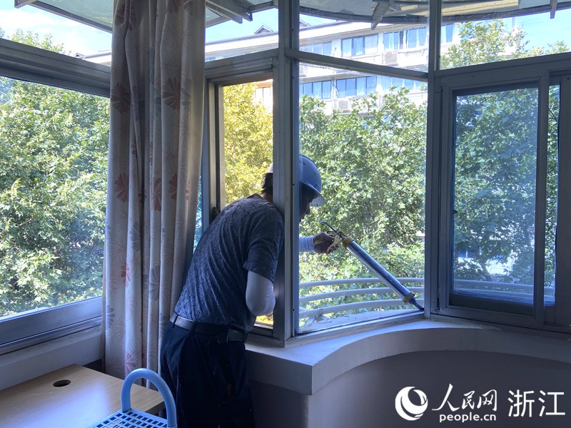 施工隊成員到王大姐家為玻璃窗打膠固定。人民網(wǎng) 方彭依夢攝