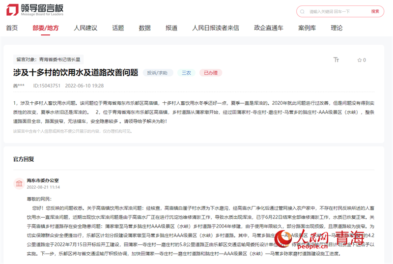 針對(duì)該群眾反映的問(wèn)題,海東市回復(fù):為切實(shí)保障群眾安全便捷出行,樂(lè)都區(qū)計(jì)劃分段建設(shè)蒲家墩至馬營(yíng)鄉(xiāng)腦莊村AAA級(jí)景區(qū)(水峽)鄉(xiāng)村道路。其中,馬營(yíng)鄉(xiāng)腦莊村-AAA級(jí)景區(qū)(水峽)-馬營(yíng)鄉(xiāng)陳家磨村的4.2公里道路定于2022年7月15日開(kāi)標(biāo)后開(kāi)工建設(shè),田蒲家村-寺莊村-磨莊村的5.8公里道路正由樂(lè)都區(qū)交通運(yùn)輸局委托設(shè)計(jì)單位設(shè)計(jì),待青海省交通運(yùn)輸廳項(xiàng)目計(jì)劃資金下達(dá)后予以實(shí)施。下一步,樂(lè)都區(qū)將與省交通運(yùn)輸廳積極協(xié)調(diào),加快田蒲家村-寺莊村-磨莊村道路和腦莊村-AAA級(jí)景區(qū)(水峽)-馬營(yíng)鄉(xiāng)陳家磨村道路建設(shè)施工進(jìn)度。