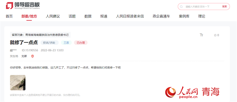 今年6月份,青海省海南州貴德縣河西鎮(zhèn)的村民胡**也遇到了鄉(xiāng)村道路損毀的問(wèn)題。他留言表示,村里的路只修了一部分,希望能徹底修好。