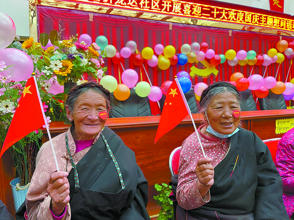 “五星紅旗迎風(fēng)飄揚(yáng),勝利歌聲多么響亮……”玉樹藏族自治州玉樹市結(jié)古街道折龍達(dá)社區(qū)的活動(dòng)室內(nèi),社區(qū)志愿者和老人們身著盛裝歡聚一堂,大家臉上洋溢著幸福的笑容,用歌聲齊祝共和國“生日快樂”。