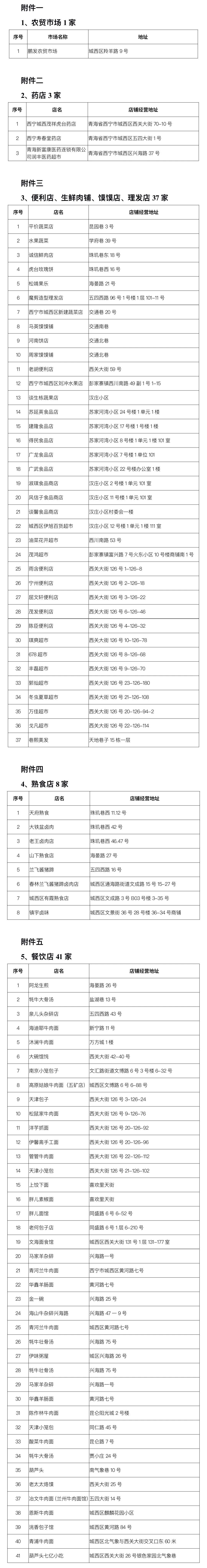 人民網(wǎng)西寧11月7日電 本網(wǎng)從西寧市城西區(qū)新冠肺炎疫情防控處置工作指揮部辦公室獲悉,經(jīng)城西區(qū)疫情防控處置工作指揮部研究決定,繼續(xù)有序開放轄區(qū)農(nóng)貿(mào)市場(chǎng)1家;藥店3家;便利店、生鮮肉鋪、饃饃店、理發(fā)店37家;熟食店8家;餐飲店41家,為廣大群眾就近提供物資供應(yīng)及生活服務(wù)。(見(jiàn)附件1、附件2、附件3、附件4、附件5)
