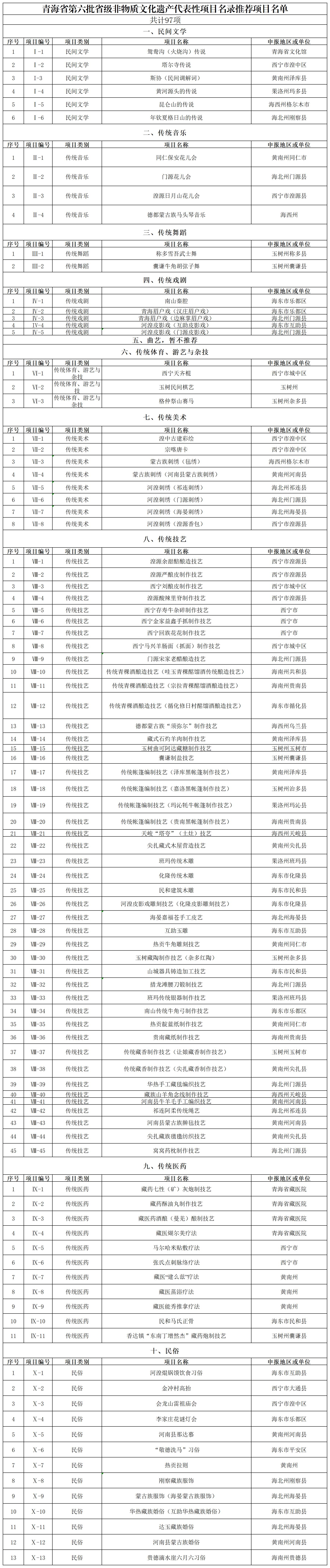 為進(jìn)一步加強(qiáng)青海省非物質(zhì)文化遺產(chǎn)名錄體系建設(shè),根據(jù)《中華人民共和國非物質(zhì)文化遺產(chǎn)法》《青海省非物質(zhì)文化遺產(chǎn)條例》和《青海省文化和旅游廳關(guān)于推薦申報(bào)第六批省級(jí)非物質(zhì)文化遺產(chǎn)代表性項(xiàng)目的通知》(青文旅發(fā)〔2021〕48號(hào))精神,青海省文化和旅游廳組織開展了青海省第六批省級(jí)非物質(zhì)文化遺產(chǎn)代表性項(xiàng)目推薦申報(bào)評(píng)審工作。經(jīng)各市州文化和旅游行政部門及相關(guān)單位推薦,共有十大類156項(xiàng)申報(bào)第六批省級(jí)非物質(zhì)文化遺產(chǎn)代表性項(xiàng)目。根據(jù)評(píng)審規(guī)則,經(jīng)省垣專家評(píng)審、青海省非遺評(píng)審工作委員會(huì)復(fù)審、征求青海省非物質(zhì)文化遺產(chǎn)保護(hù)工作協(xié)調(diào)機(jī)制成員單位意見、省文化和旅游廳廳務(wù)會(huì)議審議,擬推薦青海省第六批省級(jí)非物質(zhì)文化遺產(chǎn)代表性項(xiàng)目名錄項(xiàng)目97項(xiàng)。