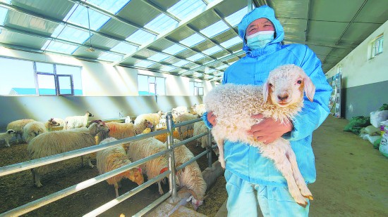 在不遠(yuǎn)處一片雪山美景的映照下,瑪沁縣聯(lián)合總社下屬白藏羊高效養(yǎng)殖基地內(nèi)一派繁忙,接羔保育的牧業(yè)生產(chǎn)旺季還未過(guò)去,成群的羊羔在現(xiàn)代化羊舍中來(lái)回走動(dòng),此起彼伏的“咩咩”聲帶來(lái)了生機(jī)活力。