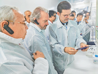 駐華使節(jié)在國家電投集團黃河上游水電開發(fā)有限責任公司西寧太陽能電力分公司光伏電池生產(chǎn)線參觀。本報記者 王海林攝
