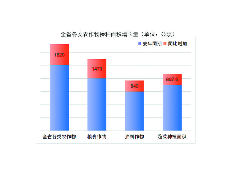 截至6月底,全省各類農(nóng)作物播種面積57.89萬公頃,同比增加1620公頃,是近年來播種面積最多的一年,其中,糧食作物增加1470公頃,油料作物增加840公頃。