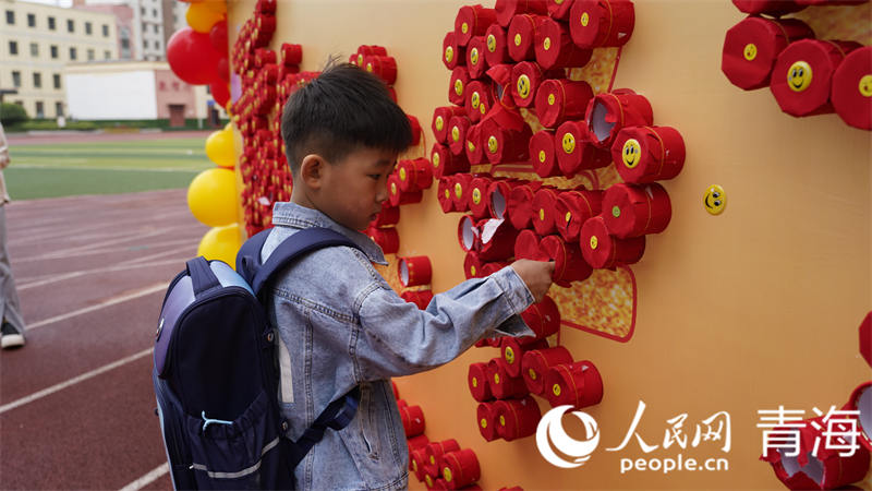 西寧市城東區(qū)曉泉小學(xué)為一年級新生準(zhǔn)備的盲盒墻。人民網(wǎng)記者 張莉萍攝