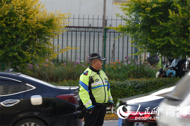 校外維持交通秩序的交警。人民網(wǎng)記者 甘海瓊攝