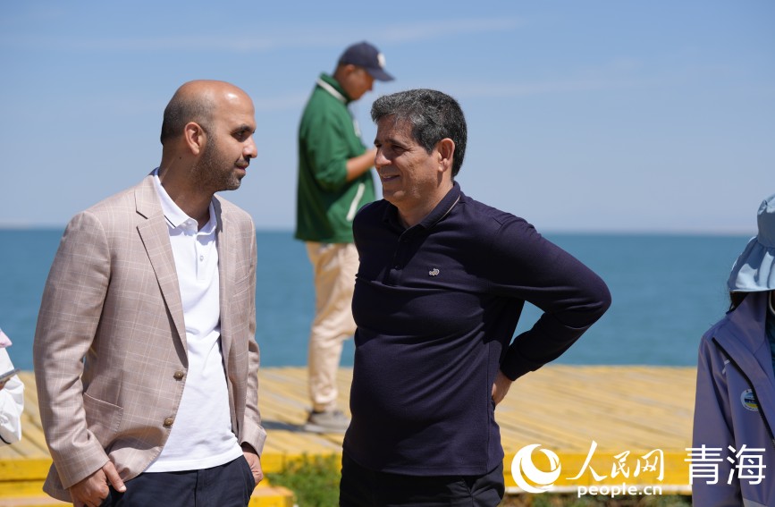 與會嘉賓在青海湖畔交談。人民網(wǎng) 馬可欣攝