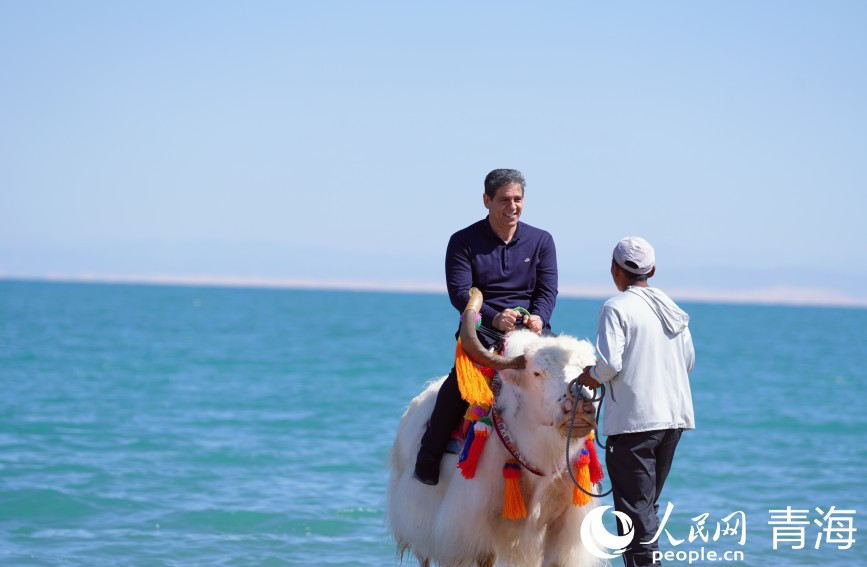 與會嘉賓在青海湖畔騎牦牛。人民網(wǎng) 馬可欣攝