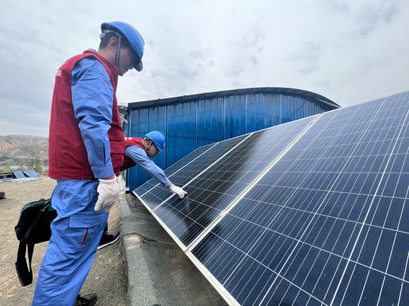 國(guó)網(wǎng)青海黃化供電公司員工在青海省黃南藏族自治州尖扎縣來(lái)玉村對(duì)光伏板發(fā)電情況進(jìn)行檢查。王成泓攝