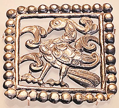“青海都蘭熱水墓群精品文物展”展出的立鳳銀飾片。