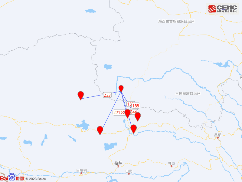 震中距西藏安多縣150公里、距西藏聶榮縣188公里、距西藏雙湖縣233公里、距西藏那曲色尼區(qū)244公里、距西藏班戈縣271公里,距西藏那曲市244公里,距青海省海西蒙古族藏族自治州695公里,距西寧市1012公里,距拉薩市437公里。