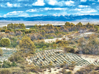近年來,青海省深入推進(jìn)荒漠化綜合防治和“三北”等重點生態(tài)工程建設(shè),實現(xiàn)了從“沙進(jìn)人退”到“綠進(jìn)沙退”的歷史性轉(zhuǎn)變,沙區(qū)生態(tài)環(huán)境明顯改善、綠色屏障更加牢固。圖為日前,海南藏族自治州農(nóng)民在黃沙頭防沙治沙區(qū)修補(bǔ)草方格。