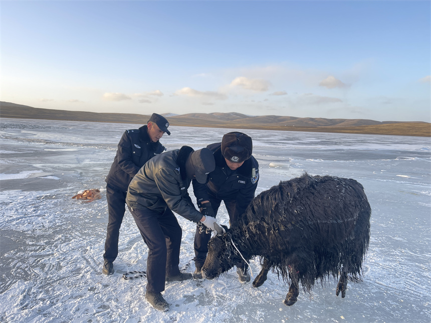11月25日下午,青海省果洛州瑪多縣公安局野牛溝派出所警員尖參尼瑪接到警情:瑪多縣瑪查理鎮(zhèn)尕拉村牧民阿強家的9頭牦牛掉進了冰湖,急需救援。隨后,瑪多縣公安局野牛溝派出所民輔警一行由一名當地老人帶路,第一時間抵達30公里外的事故現(xiàn)場,展開救援工作。經民輔警、牧民群眾、政府工作人員、消防員等4個多小時的救援,9頭牦牛全部救上岸,幸存一頭小牦牛。(陳明菊)