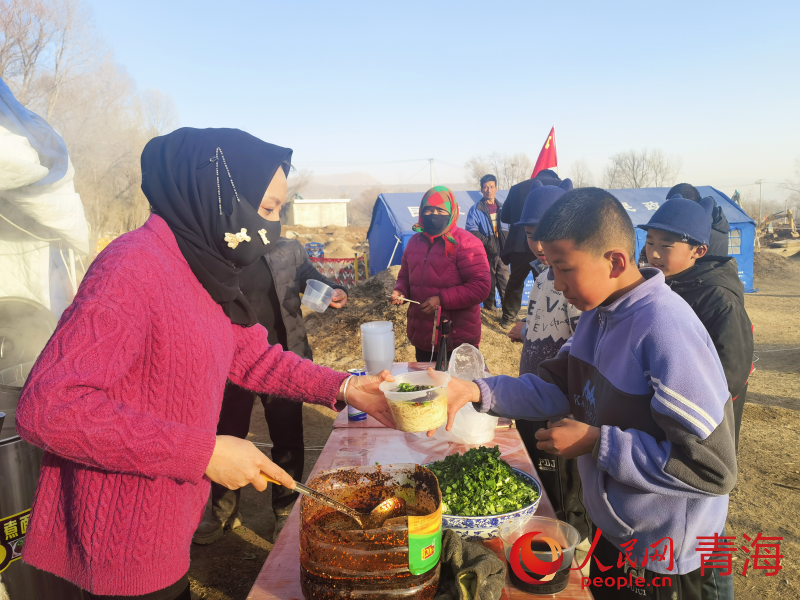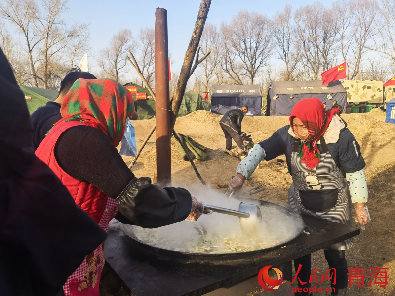 在民和縣中川鄉(xiāng)金田村,搜救工作仍在進(jìn)行中。傍晚時(shí)分,搜救現(xiàn)場(chǎng)已經(jīng)升起炊煙。由當(dāng)?shù)卮迕褡园l(fā)組成的“村民先鋒崗”早已支起大鍋,做起了熱氣騰騰的面條。