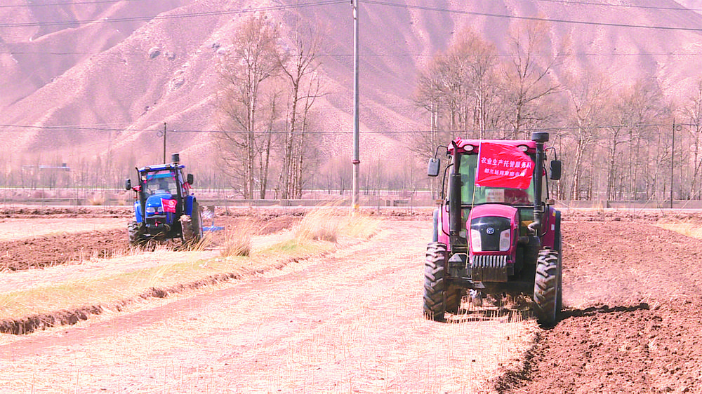 “土地托管”后服務(wù)隊(duì)在耕地里進(jìn)行耕作。尖措 攝