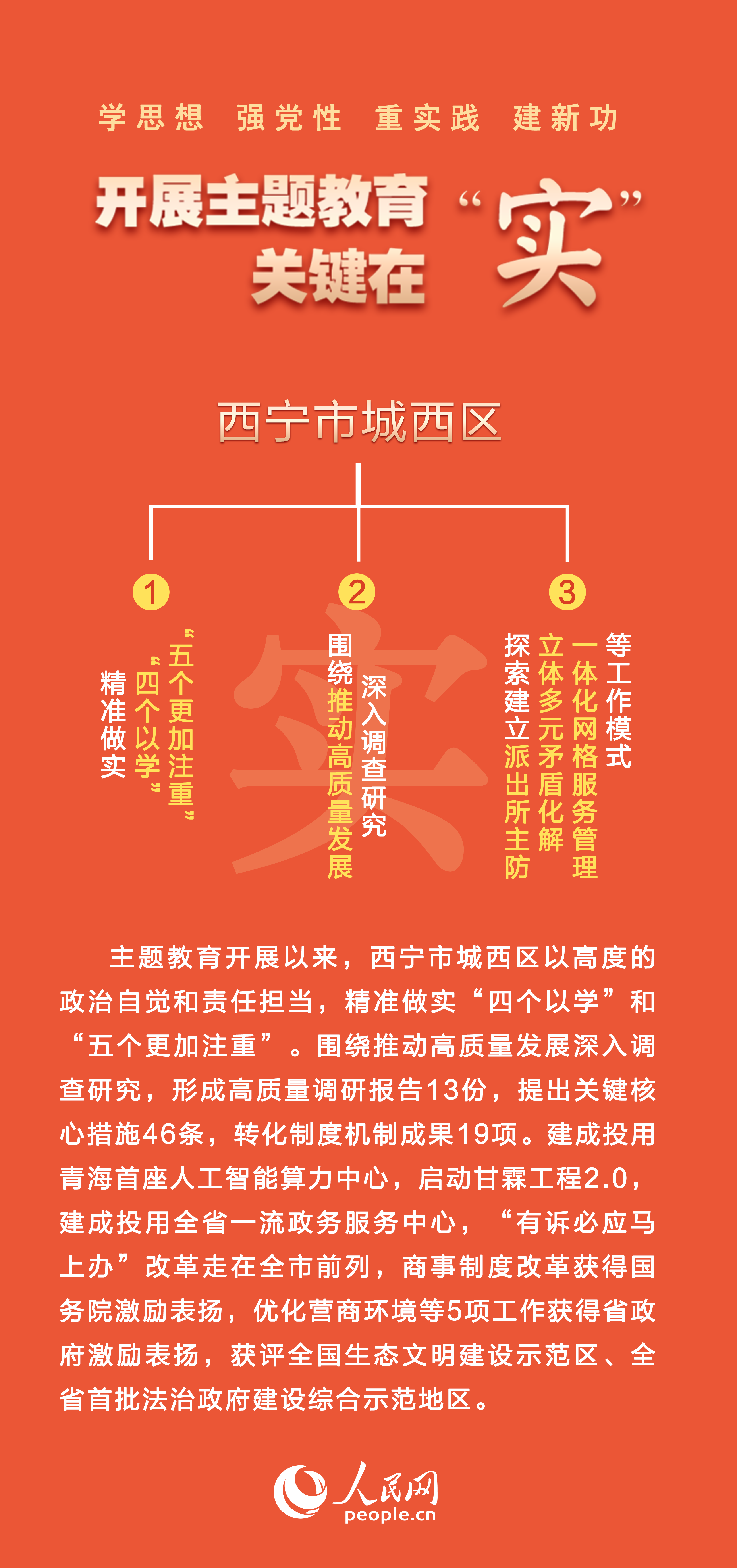 城西區(qū)委始終堅(jiān)持思想引領(lǐng)干、以上率下干、倒逼推動(dòng)干、提升能力干,以深化全面從嚴(yán)治黨、加強(qiáng)生態(tài)文明建設(shè)、推動(dòng)民族團(tuán)結(jié)進(jìn)步、推動(dòng)鄉(xiāng)村振興、推動(dòng)服務(wù)和引領(lǐng)產(chǎn)業(yè)“四地”建設(shè)“五個(gè)實(shí)踐載體”為抓手,用履職作為的實(shí)績(jī)實(shí)效檢驗(yàn)主題教育成果,讓人民群眾切身感受到主題教育帶來(lái)的新變化。