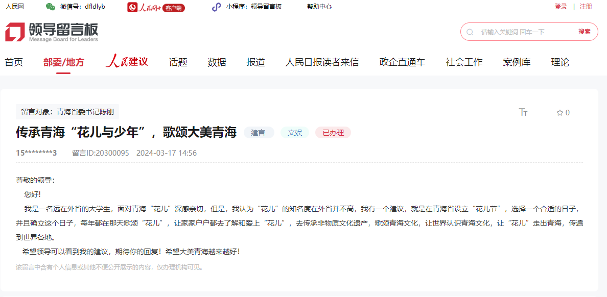 設(shè)立“花兒與少年”主題節(jié)日,人們唱起“花兒”跳起舞;傳承非物質(zhì)文化遺產(chǎn),挖掘青海藝術(shù)文化……外地上學(xué)的“青海娃”在“領(lǐng)導(dǎo)留言板”建議,希望多措并舉讓“花兒與少年”走出青海,傳唱世界各地。