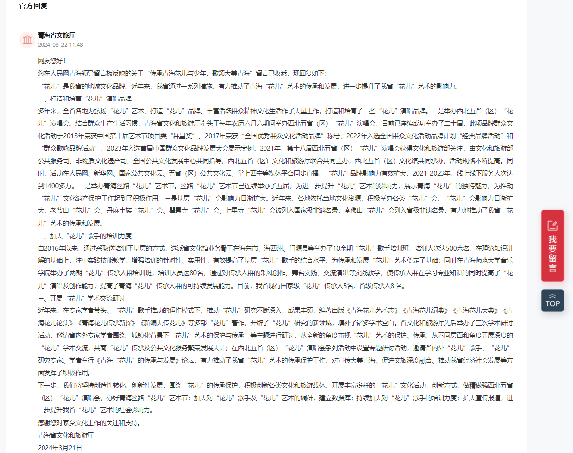 “‘花兒’是青海省的地域文化品牌?!笔障と罕妼?duì)家鄉(xiāng)文化傳承發(fā)揚(yáng)的建議后,青海省文化與旅游廳從打造和培育“花兒”演唱品牌、加大“花兒”歌手的培訓(xùn)力度、開(kāi)展“花兒”學(xué)術(shù)交流研討三個(gè)方面作了具體回復(fù)。