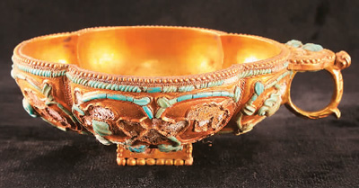 唐吐蕃時(shí)期鑲嵌綠松石四曲鋬指金杯。青海省海西州民族博物館供圖