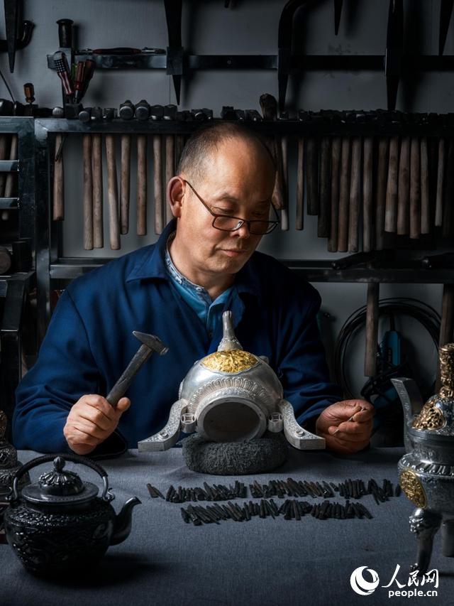 國家級非遺項(xiàng)目湟中銀銅器制作及鎏金技藝傳承人何滿。人民網(wǎng) 雷陽攝