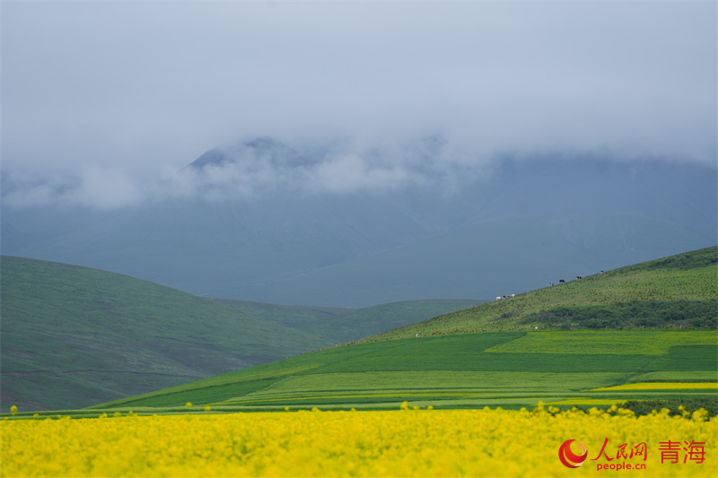云霧繚繞的山腳下,一片片金黃色的油菜花盛開(kāi)。人民網(wǎng) 顧斐菲攝