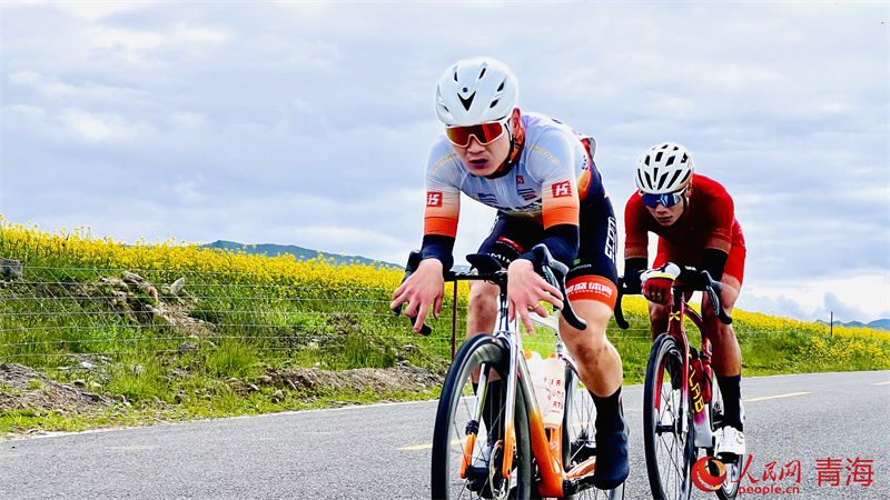 運(yùn)動(dòng)員在花海中騎行。人民網(wǎng) 顧斐菲攝