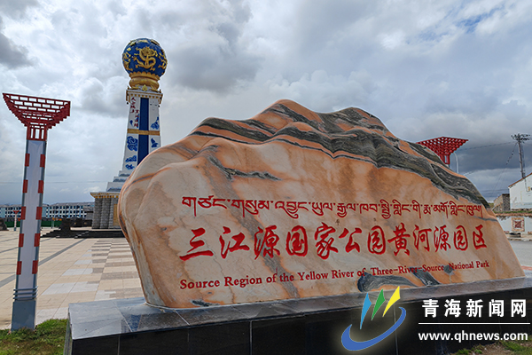 豎立在瑪多縣委縣政府前的黃河源頭紀念碑??琢罾跀z