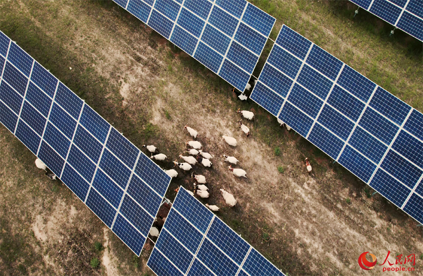 光伏板下正在悠閑吃草的羊群。人民網(wǎng) 馬可欣攝