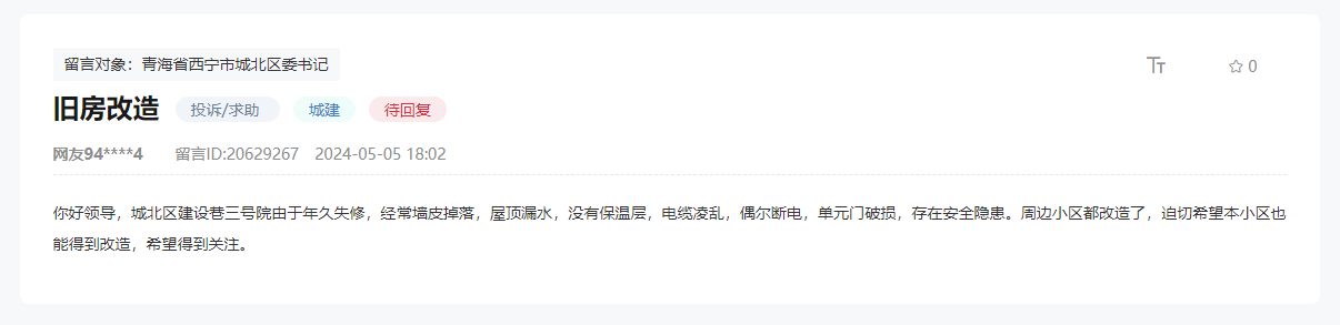 “西寧市城北區(qū)建設巷三號院年久失修,墻皮掉落,屋頂漏水,無保溫層,電纜凌亂,偶爾斷電,單元門破損,存在安全隱患。周邊小區(qū)都改造了,迫切希望本小區(qū)也能改造?!?/p>